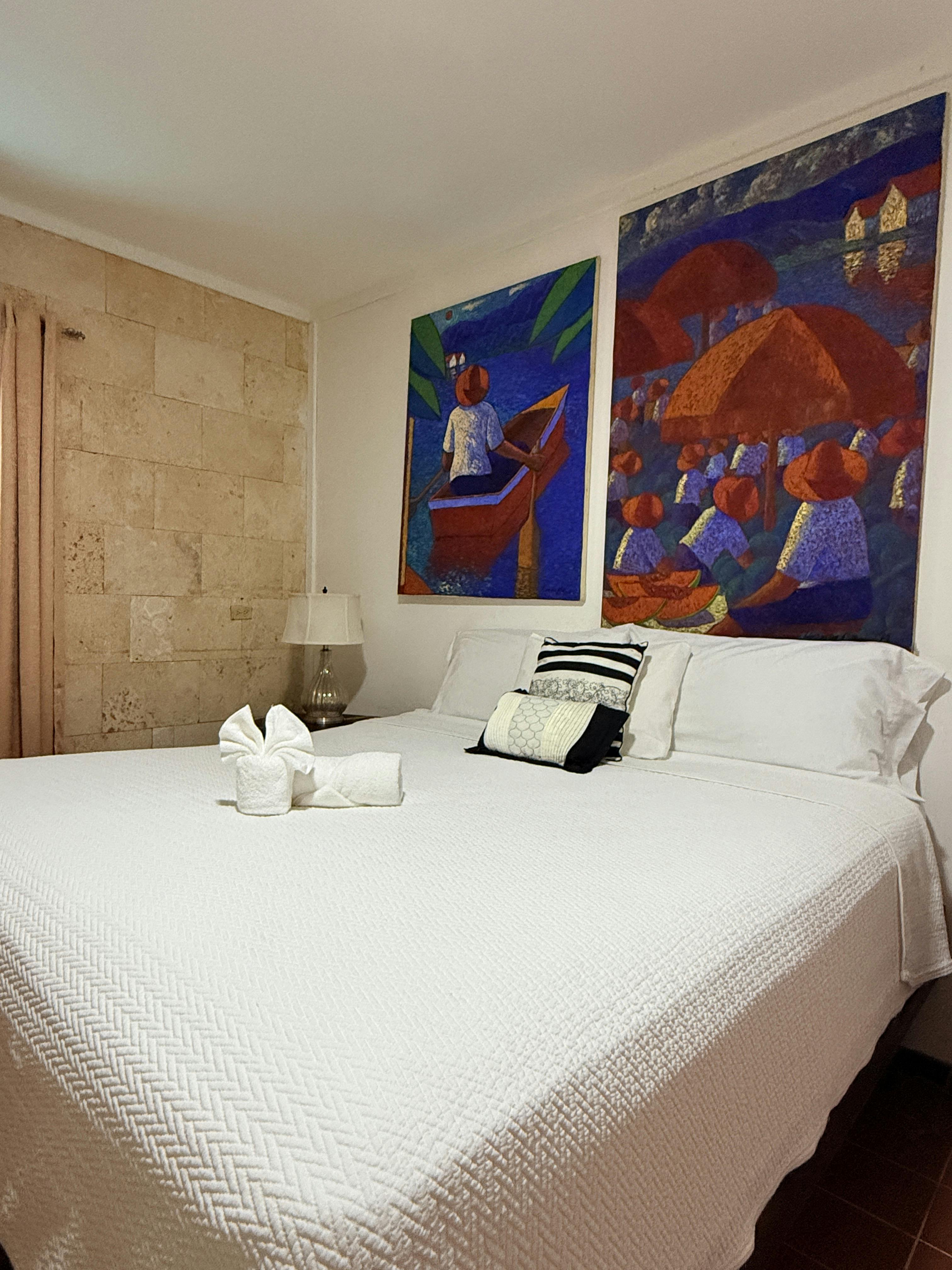 Room with a double bed, air conditioning, ceiling fan, direct access to the common room.